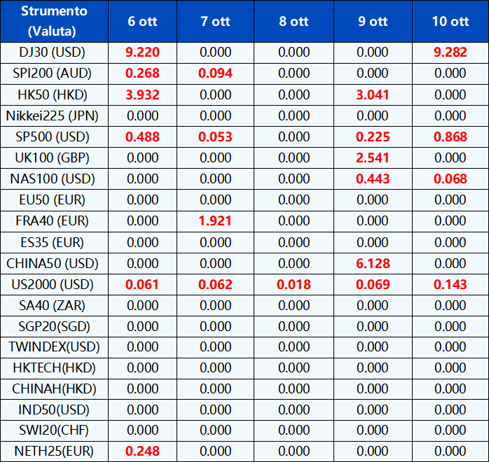 Si prega di notare che i dati sopra riportati sono soggetti a modifiche. Si prega di fare riferimento a MT4/MT5 per i dettagli.