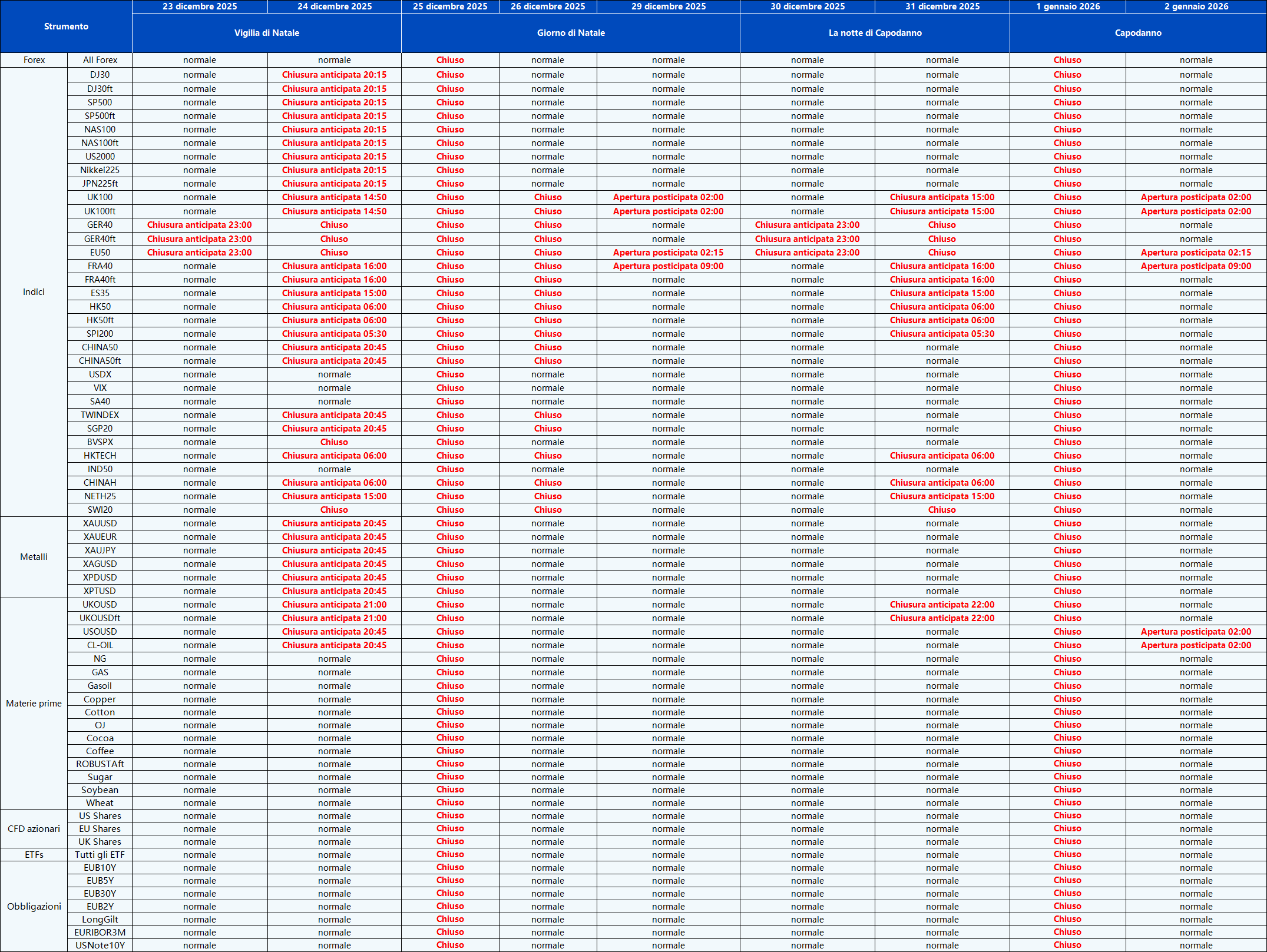 Vi informiamo che gli orari di negoziazione e gli orari delle sessioni di mercato dei seguenti strumenti saranno influenzati dalle prossime festività di dicembre.