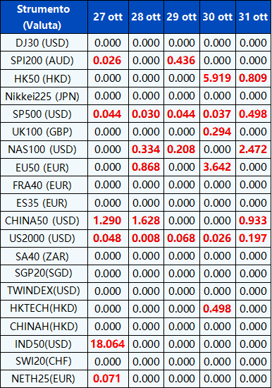 Si prega di notare che i dati sopra riportati sono soggetti a modifiche. Si prega di fare riferimento a MT4/MT5 per i dettagli.