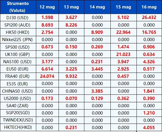 Si prega di notare che i dati sopra riportati sono soggetti a modifiche. Si prega di fare riferimento a MT4/MT5 per i dettagli.