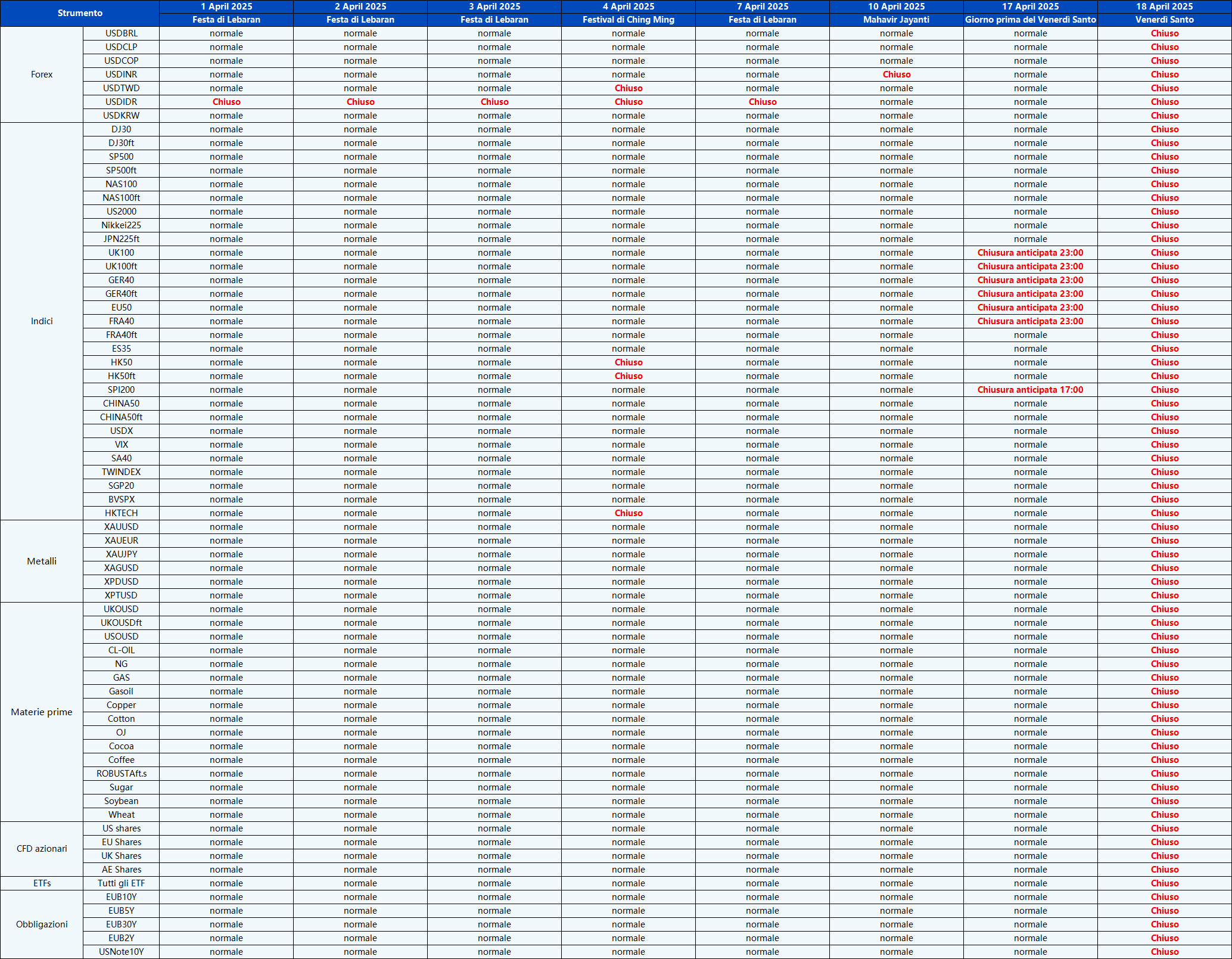 Vi informiamo che gli orari di negoziazione e le sessioni di mercato dei seguenti strumenti saranno influenzati dalle prossime festività di inizio aprile.