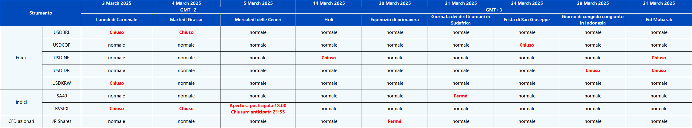 Vi informiamo che gli orari di negoziazione e gli orari delle sessioni di mercato dei seguenti strumenti saranno influenzati dalle prossime festività di marzo.