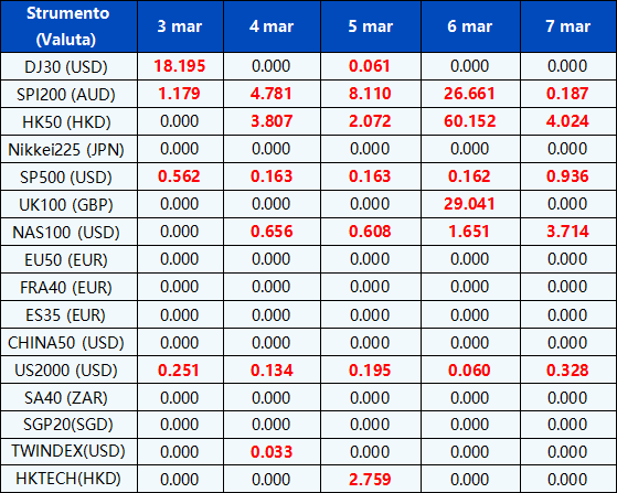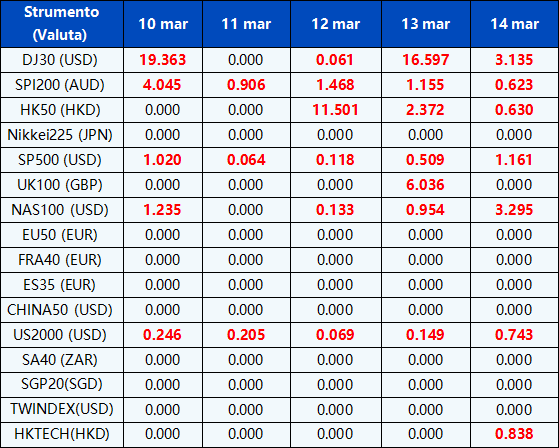 Si prega di notare che i dati sopra riportati sono soggetti a modifiche. Si prega di fare riferimento a MT4/MT5 per i dettagli.
