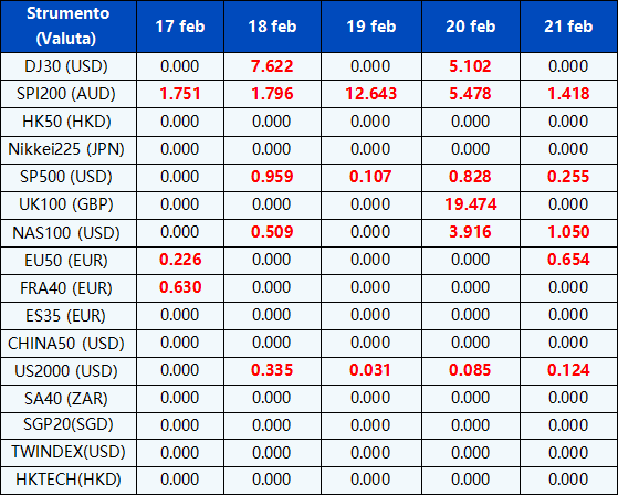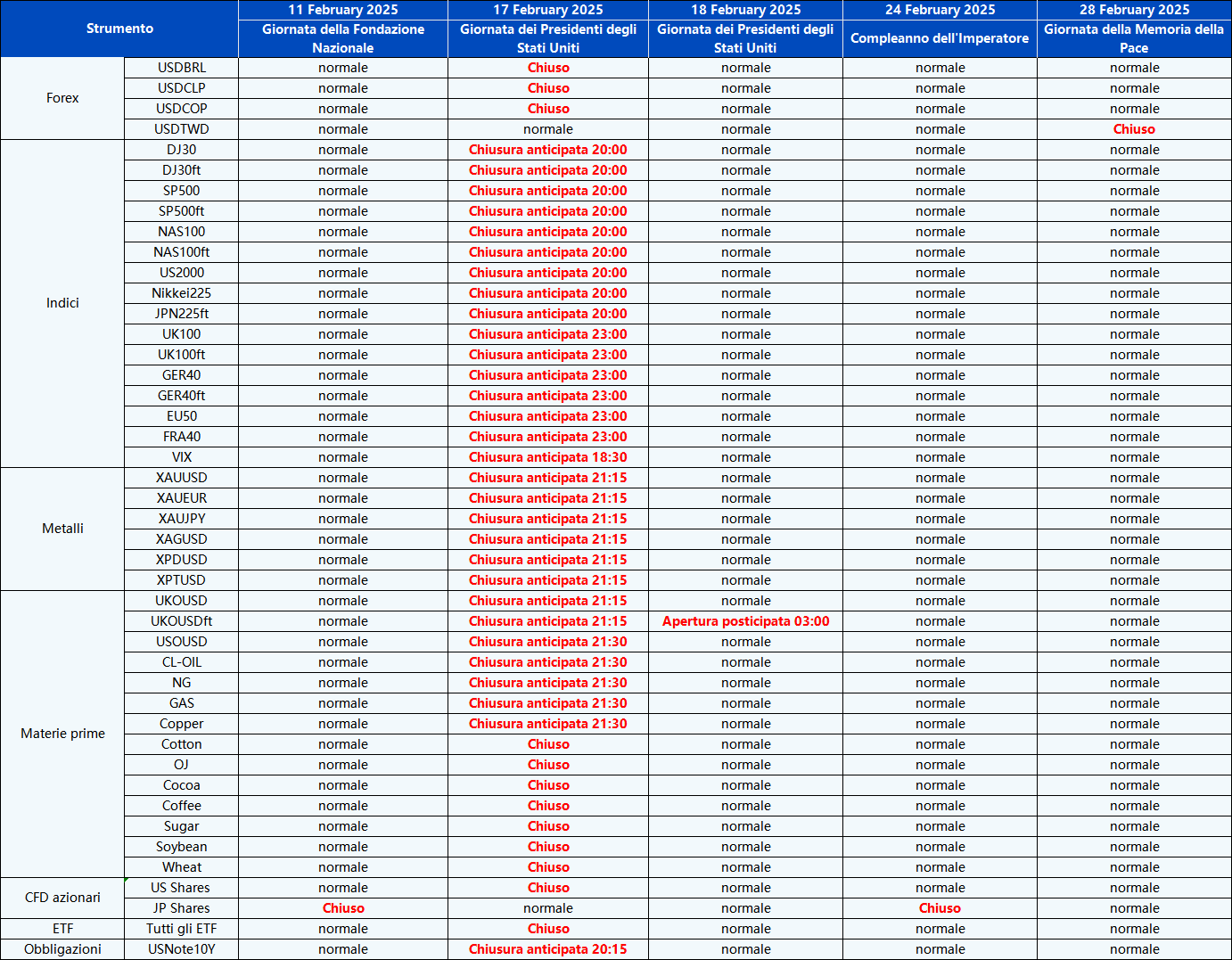 Vi informiamo che gli orari di negoziazione e gli orari delle sessioni di mercato dei seguenti strumenti saranno influenzati dalle prossime festività di febbraio.