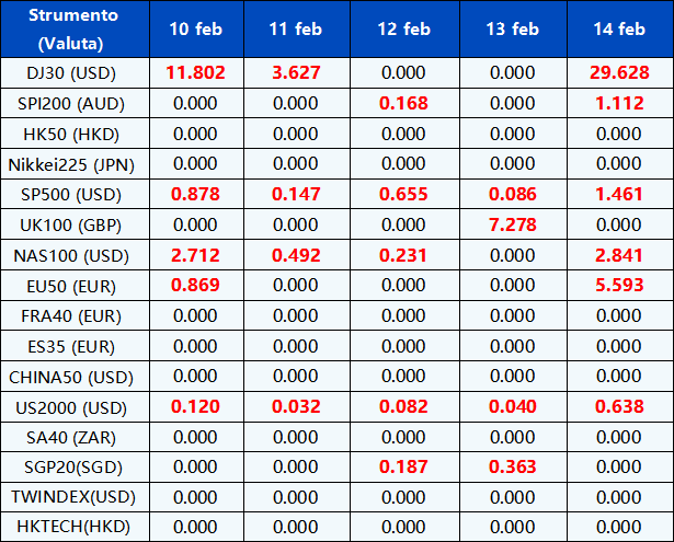 Si prega di notare che i dati sopra riportati sono soggetti a modifiche. Si prega di fare riferimento a MT4/MT5 per i dettagli.