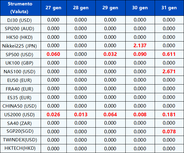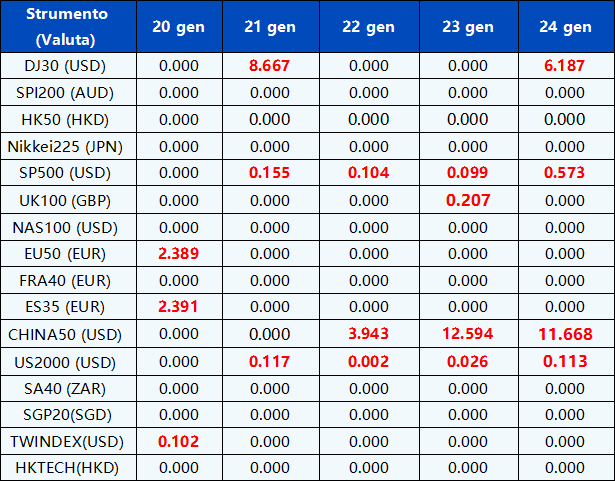 Si prega di notare che i dati sopra riportati sono soggetti a modifiche. Si prega di fare riferimento a MT4/MT5 per i dettagli.