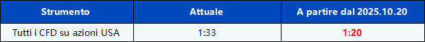 Si prega di notare che la leva su tutti i prodotti CFD delle azioni statunitensi sarà regolata a partire dal 20 ottobre 2025 per ottimizzare ulteriormente la competitività e migliorare l’ambiente di trading.