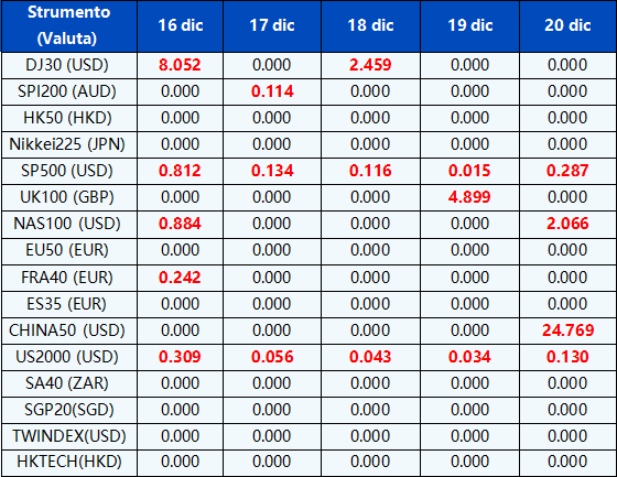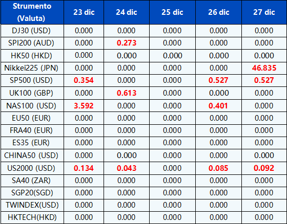 Vi informiamo che gli orari di negoziazione e gli orari delle sessioni di mercato dei seguenti strumenti saranno influenzati dalle prossime festività di dicembre.