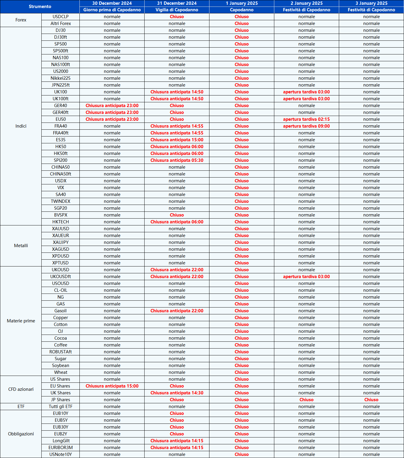 Si prega di notare che che gli orari di negoziazione e le sessioni di mercato dei seguenti strumenti saranno influenzati dalle prossime festività di Capodanno.