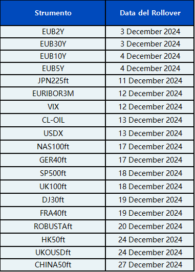 Si prega di notare che i seguenti strumenti CFD saranno sottoposti automaticamente a rollover secondo le date indicate nella tabella sottostante. Poiché può esserci una differenza di prezzo tra i vecchi e i nuovi contratti futures, raccomandiamo ai clienti di monitorare attentamente le loro posizioni e di gestire le posizioni di conseguenza.