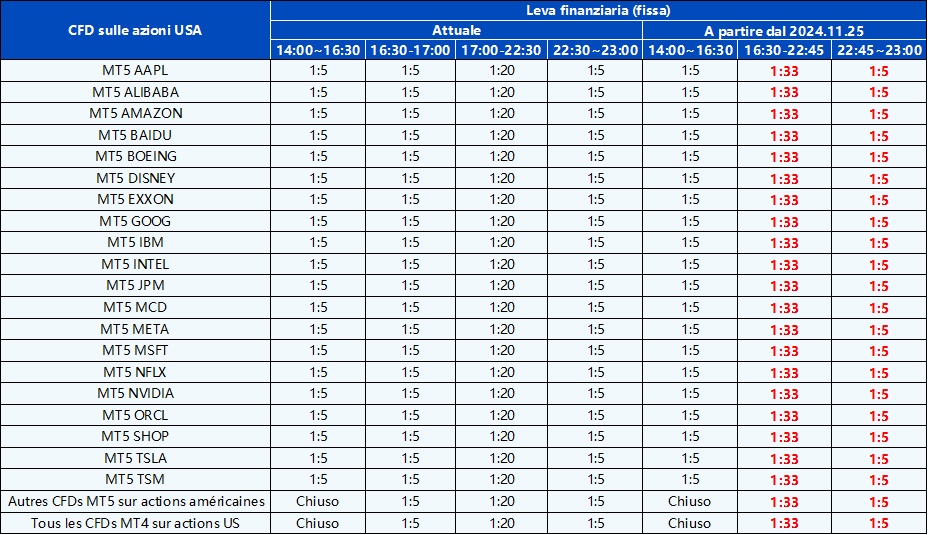 Vi informiamo che la leva su tutti i prodotti CFD su azioni sarà adeguata a partire dal 25 novembre 2024 per ottimizzare ulteriormente la competitività e migliorare l’ambiente di trading.