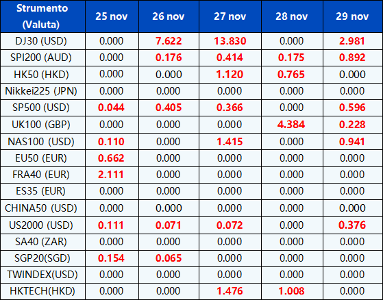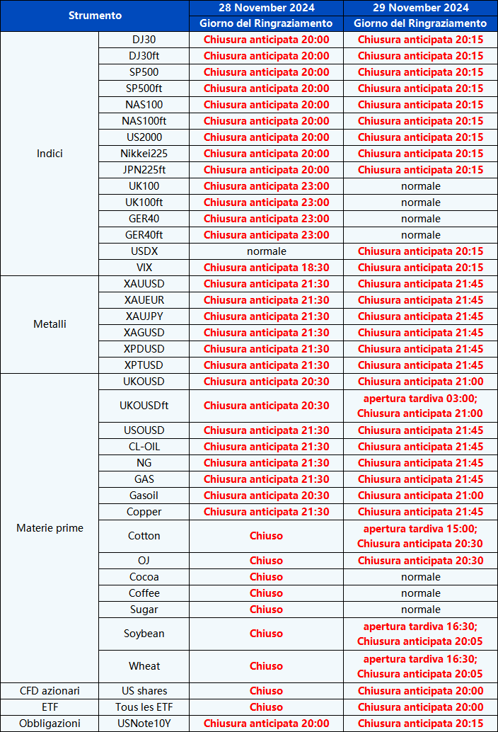 Si prega di notare che gli orari di trading e le sessioni di mercato dei seguenti strumenti saranno influenzati dalle prossime festività del Giorno del Ringraziamento.