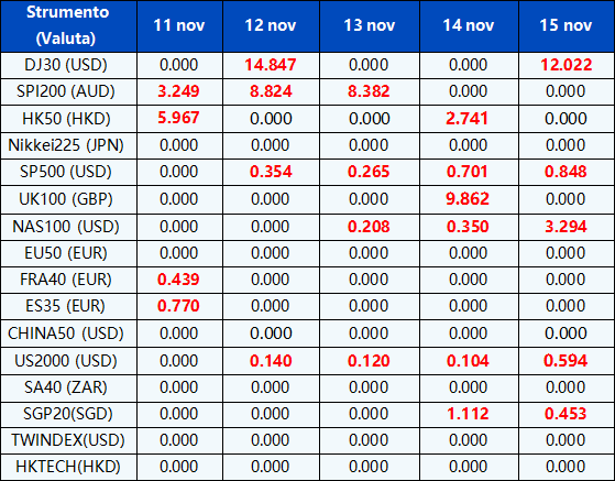 Si prega di notare che i dividendi dei seguenti CFD sull’indice saranno regolati dalle prossime date ex-dividendo. Il commento per il trading di CFD sull’indice sarà nel seguente formato “Div&<Product Name>&<Net Volume>” che appare nel saldo dopo la chiusura del giorno precedente alla data di pagamento del dividendo.