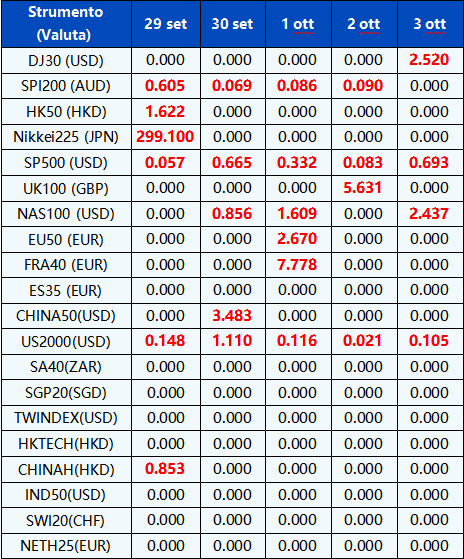 Si prega di notare che i dati sopra indicati sono soggetti a modifiche. Consultare MT4/MT5 per i dettagli.