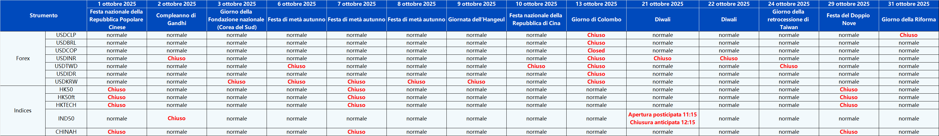 Vi informiamo che gli orari di negoziazione e gli orari delle sessioni di mercato dei seguenti strumenti saranno influenzati dalle prossime festività di ottobre.