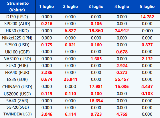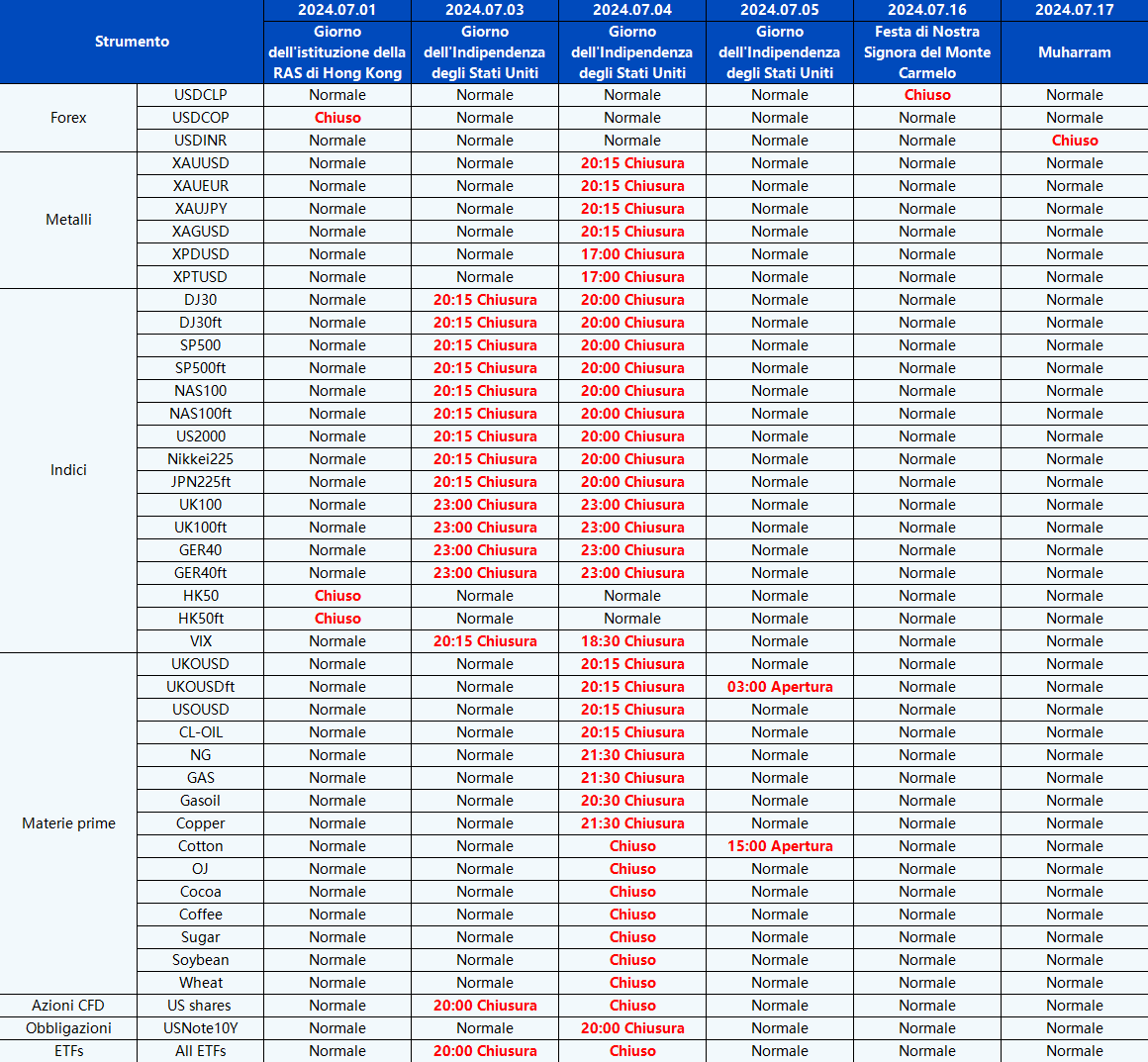 Vi informiamo che gli orari di negoziazione e gli orari delle sessioni di mercato dei seguenti strumenti saranno influenzati dalle prossime festività di luglio.