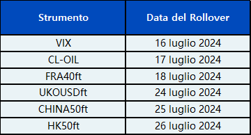 Si prega di notare che i seguenti strumenti CFD saranno sottoposti automaticamente a rollover secondo le date indicate nella tabella sottostante. Poiché può esserci una differenza di prezzo tra i vecchi e i nuovi contratti futures, raccomandiamo ai clienti di monitorare attentamente le loro posizioni e di gestire le posizioni di conseguenza.