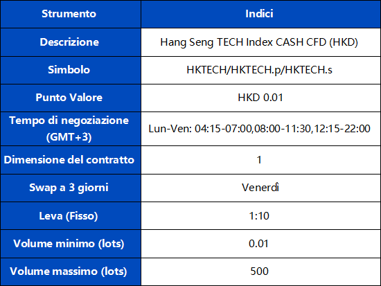Desideriamo sottolineare che il trading con noi avverrà con i CFD. Gli Hang Seng Tech Index Cash sono contratti non consegnabili che vengono regolati in contanti in base alle variazioni di prezzo dell’asset.
