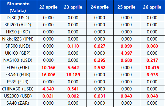 Si prega di notare che i dividendi dei seguenti CFD sull’indice saranno regolati dalle prossime date ex-dividendo. Il commento per il trading di CFD sull’indice sarà nel seguente formato “Div&<Product Name>&<Net Volume>” che appare nel saldo dopo la chiusura del giorno precedente alla data di pagamento del dividendo.