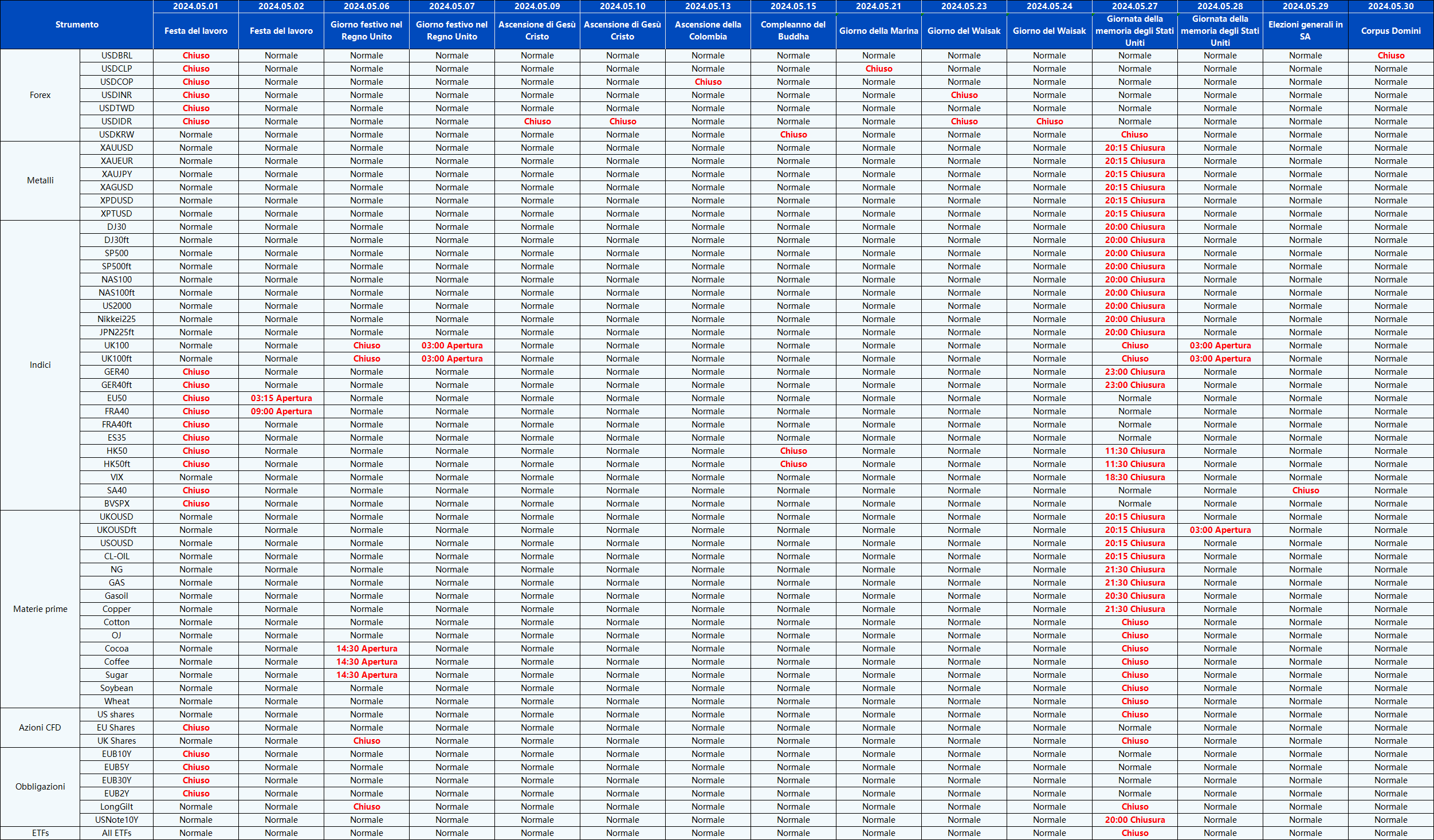 Vi informiamo che gli orari di negoziazione e gli orari delle sessioni di mercato dei seguenti strumenti saranno influenzati dalle prossime festività di maggio.