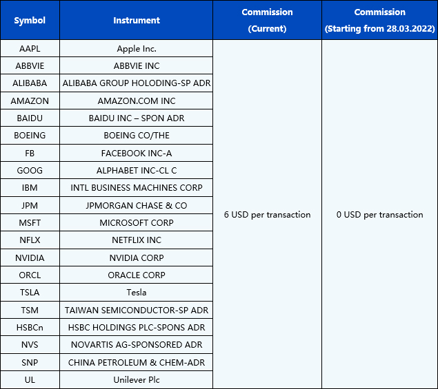 Please be advised that the commission on some of the US Share CFDs products will be decreased to 0 USD per transaction starting from 28th March 2022 to further optimize the competitiveness and improve the trading environment.
