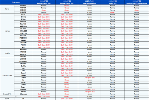 Please be advised that the following instruments’ trading hours and market session times will be affected by the upcoming July holidays.