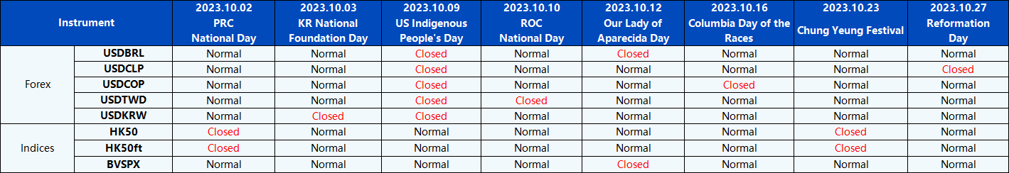 Please be advised that the following instruments’ trading hours and market session times will be affected by the upcoming October holidays.
