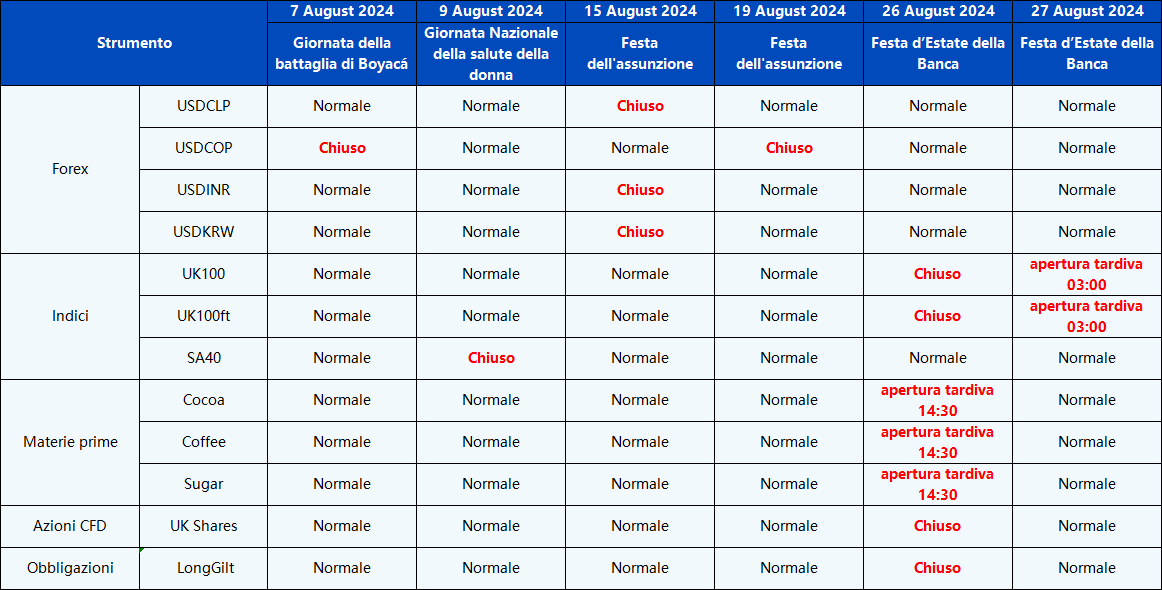 Vi informiamo che gli orari di negoziazione e gli orari delle sessioni di mercato dei seguenti strumenti saranno influenzati dalle prossime festività di luglio.