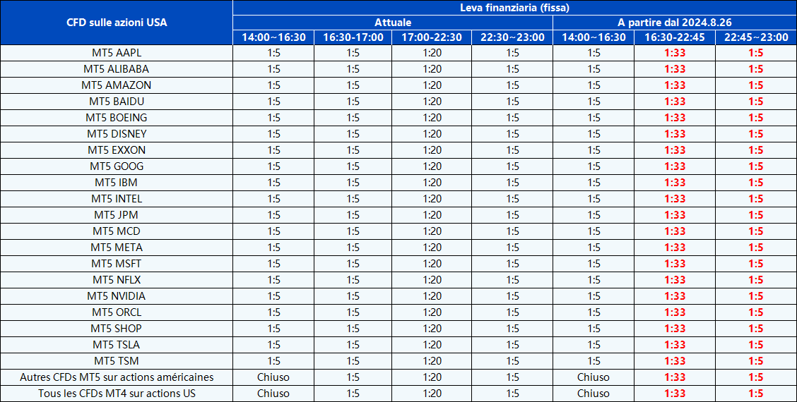Vi informiamo che la leva su tutti i prodotti CFD su azioni sarà adeguata a partire dal 26 agosto 2024 per ottimizzare ulteriormente la competitività e migliorare l’ambiente di trading.