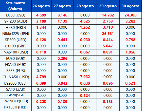 Si prega di notare che i dati sopra riportati sono soggetti a modifiche. Si prega di fare riferimento a MT4/MT5 per i dettagli.