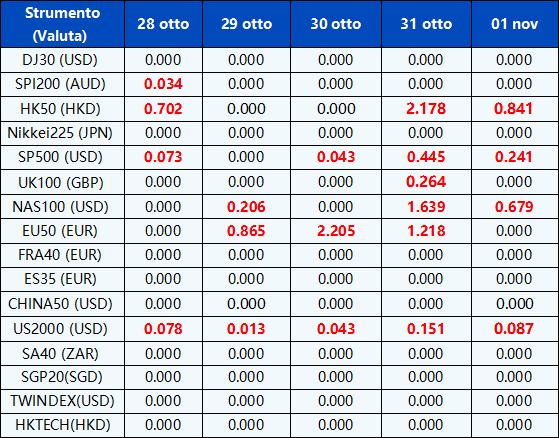 Si prega di notare che i dati sopra riportati sono soggetti a modifiche. Si prega di fare riferimento a MT4/MT5 per i dettagli.