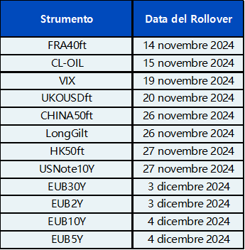 Si prega di notare che i seguenti strumenti CFD saranno sottoposti automaticamente a rollover secondo le date indicate nella tabella sottostante. Poiché può esserci una differenza di prezzo tra i vecchi e i nuovi contratti futures, raccomandiamo ai clienti di monitorare attentamente le loro posizioni e di gestire le posizioni di conseguenza.