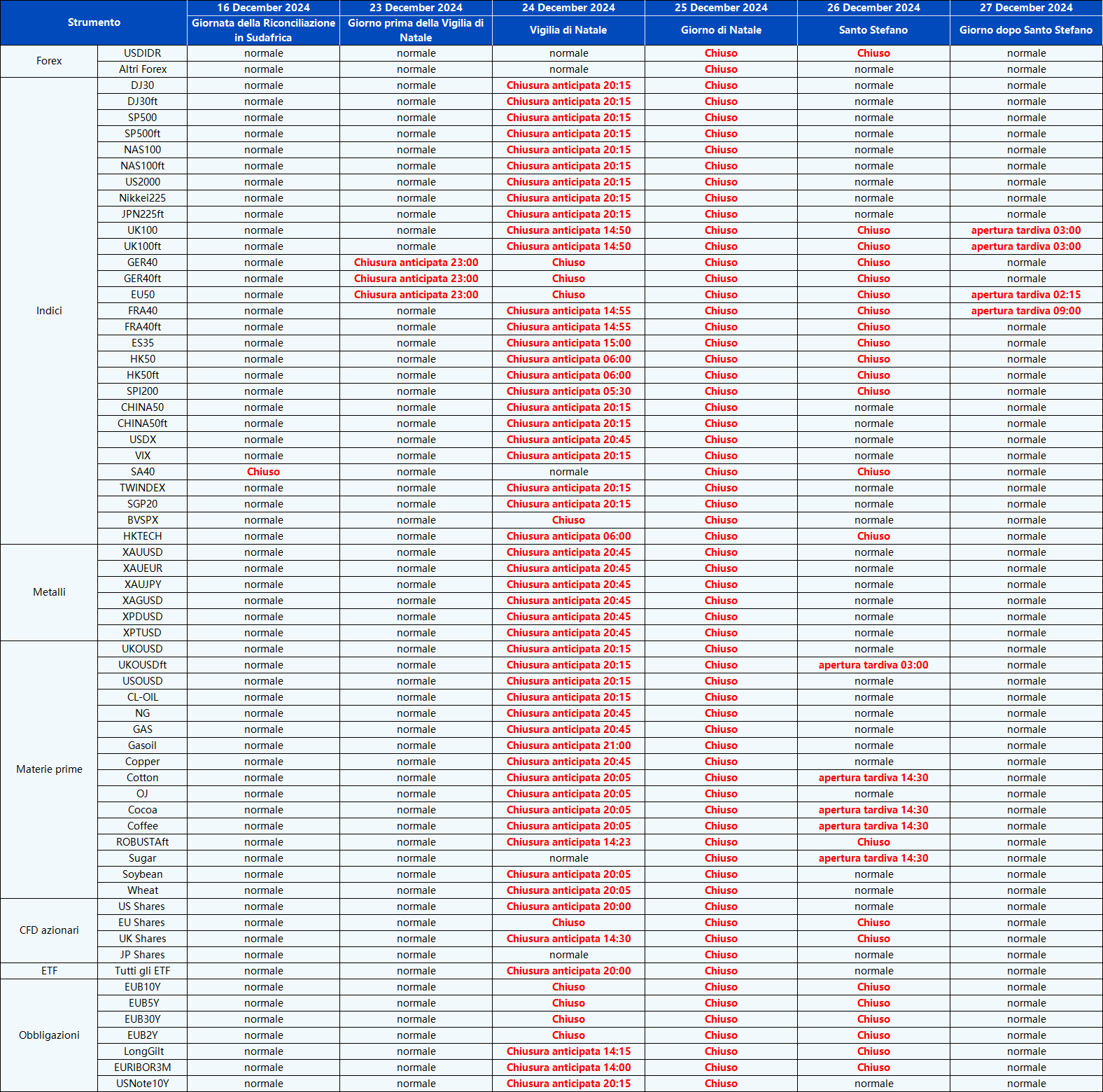 Vi informiamo che gli orari di negoziazione e gli orari delle sessioni di mercato dei seguenti strumenti saranno influenzati dalle prossime festività di dicembre.