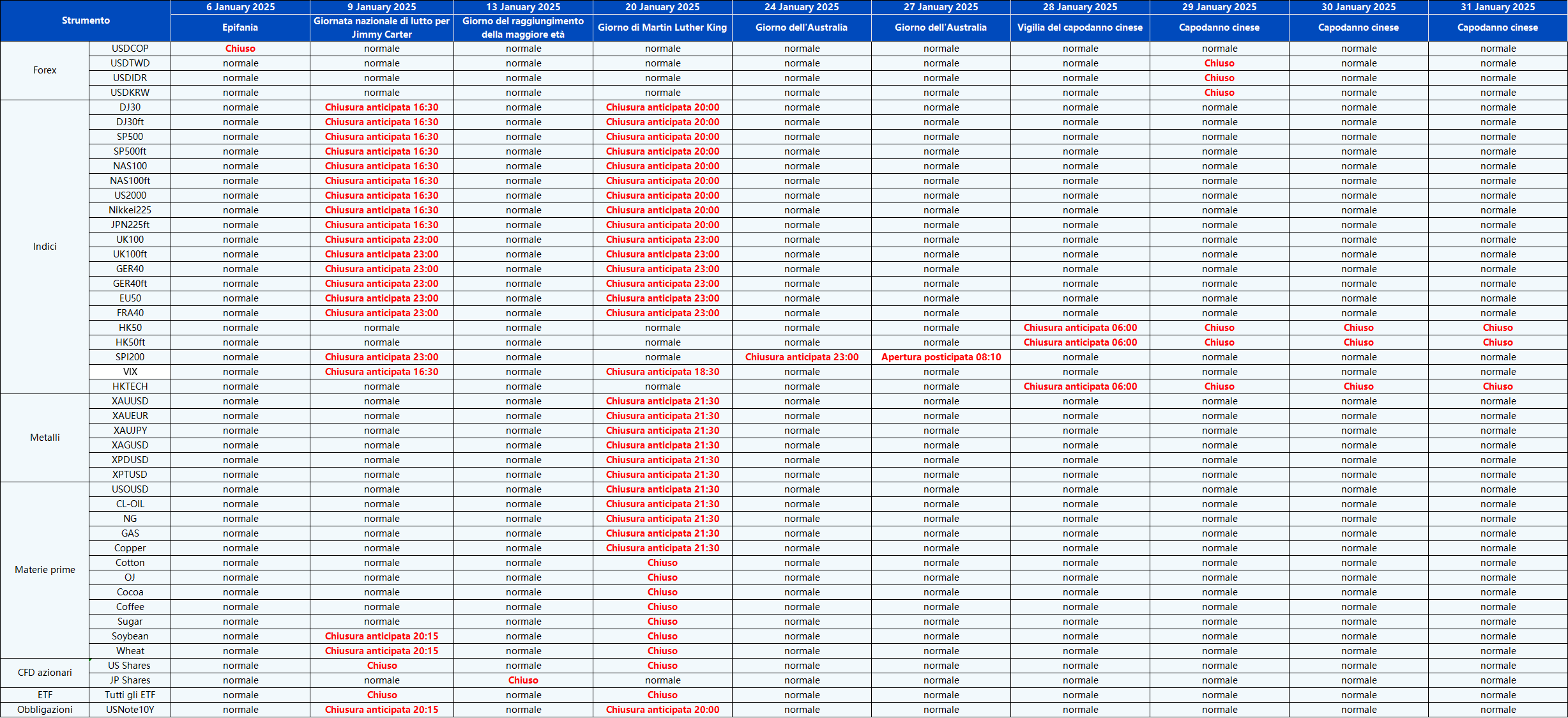 Vi informiamo che gli orari di negoziazione e gli orari delle sessioni di mercato dei seguenti strumenti saranno influenzati dalle prossime festività di gennaio.