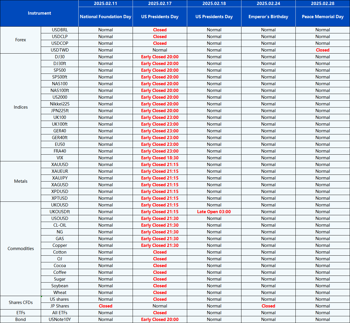Please be advised that the following instruments’ trading hours and market session times will be affected by the upcoming February holidays.