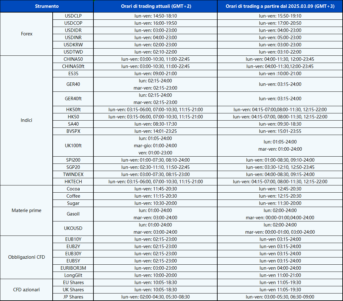 Ad eccezione del cambiamento dell’orario del server nel sistema MT4/MT5, si prega di consultare la tabella sottostante per il programma di tutti gli strumenti soggetti a modifiche: