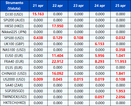 Si prega di notare che i dividendi dei seguenti CFD sull’indice saranno regolati dalle prossime date ex-dividendo. Il commento per il trading di CFD sull’indice sarà nel seguente formato “Div&<Product Name>&<Net Volume>” che appare nel saldo dopo la chiusura del giorno precedente alla data di pagamento del dividendo.