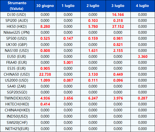 Si prega di notare che i dividendi dei seguenti CFD sull’indice saranno regolati dalle prossime date ex-dividendo. Il commento per il trading di CFD sull’indice sarà nel seguente formato “Div&<Product Name>&<Net Volume>” che appare nel saldo dopo la chiusura del giorno precedente alla data di pagamento del dividendo.