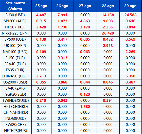 Si prega di notare che i dati sopra riportati sono soggetti a modifiche. Si prega di fare riferimento a MT4/MT5 per i dettagli.