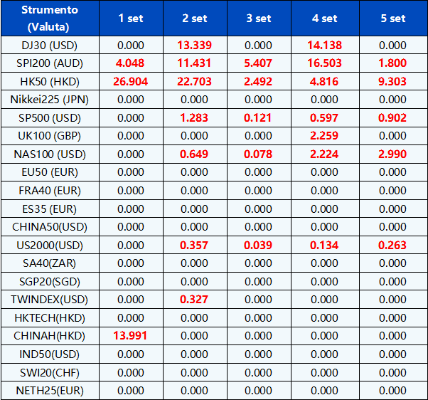 Si prega di notare che i dati sopra riportati sono soggetti a modifiche. Si prega di fare riferimento a MT4/MT5 per i dettagli.