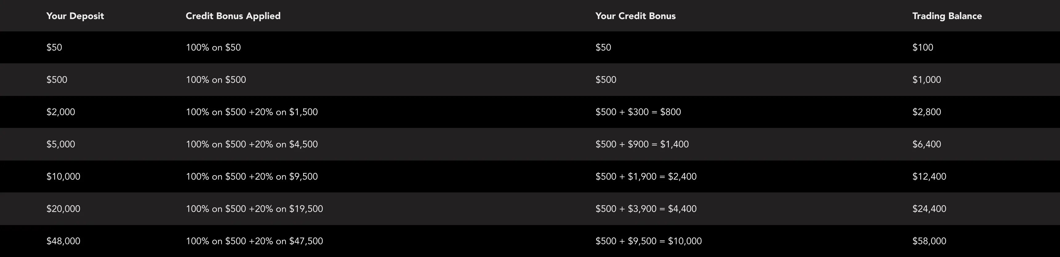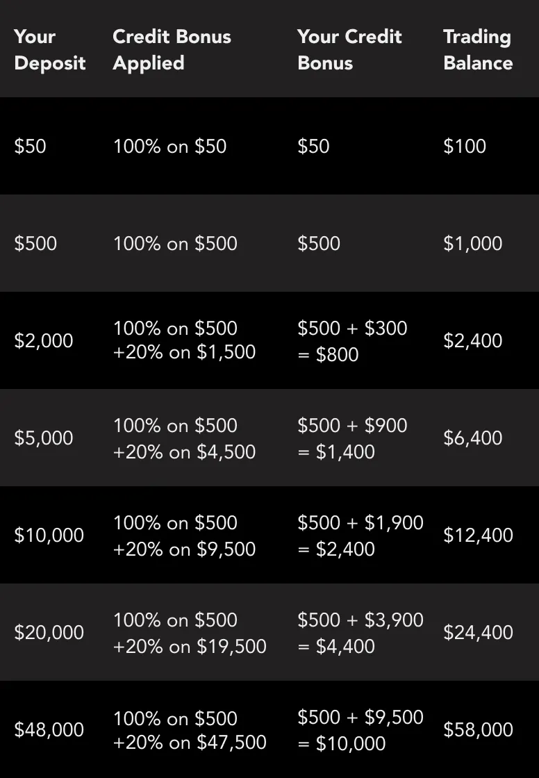 4.Eligible Clients (both new and existing clients), who meet the criteria set forth herein are able to receive credit bonuses or otherwise known as trading credit, equal to:
