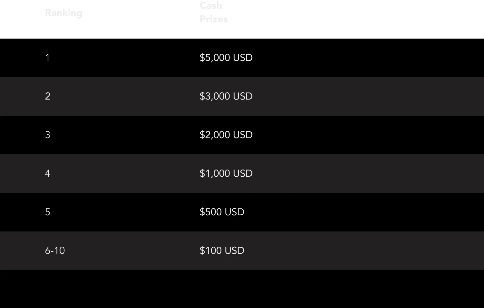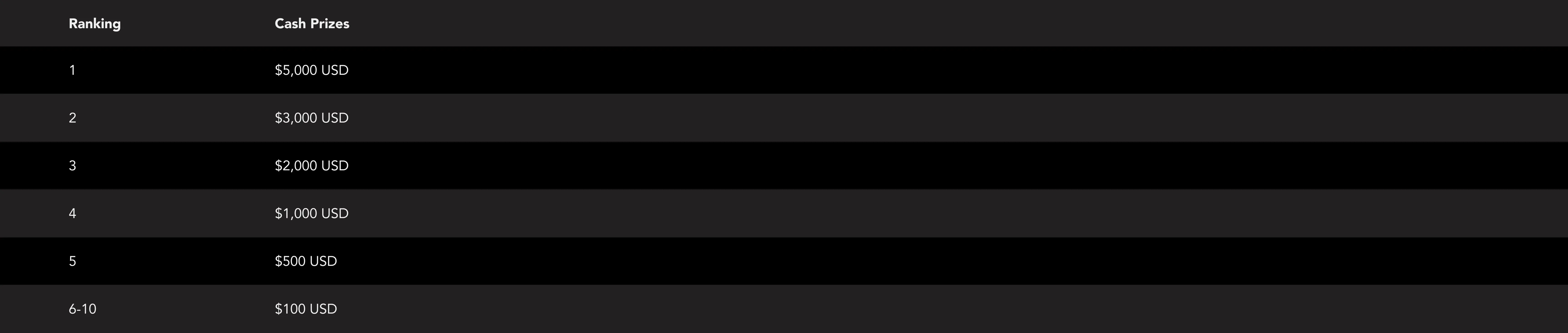 Prize Distribution Table: Cash Prizes in USD by Ranking